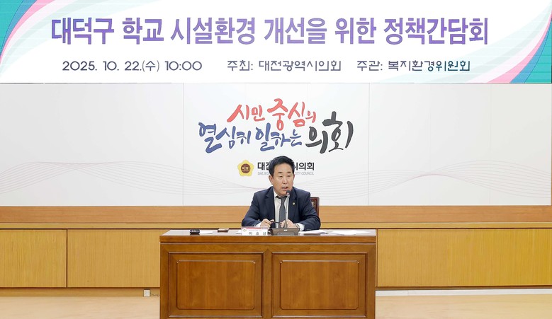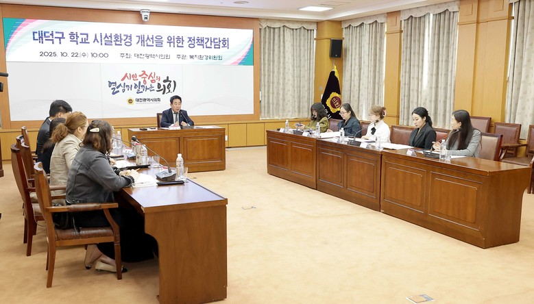 [대전 세계타임즈=이채봉 기자] 대전시의회는 22일 시의회 소통실에서 ‘대덕구 학교 시설환경 개선을 위한 정책간담회’를 개최했다.