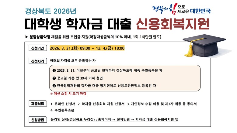- 학자금 대출 이자 지원 전 구간 확대, 신용 회복 지원 초입금 10%로 상향 - [세계타임즈=경북 한윤석 기자] 경북도가 도내 학자금 대출을 받은 대학생과 학자금 대출 장기 연체로 신용도 판단 정보에 등록된 사람을 대상으로 이자 지원 구간과 회복지원 범위를 확대해 경제적 부담 완화에 나선다.