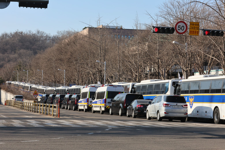 [세계타임즈 = 이채봉 기자] 고위공직자범죄수사처가 윤석열 대통령에 대한 체포영장 집행에 나선 3일 정부과천청사 공수처 인근 도로에 경찰버스가 배치돼 있다. 2025.1.3