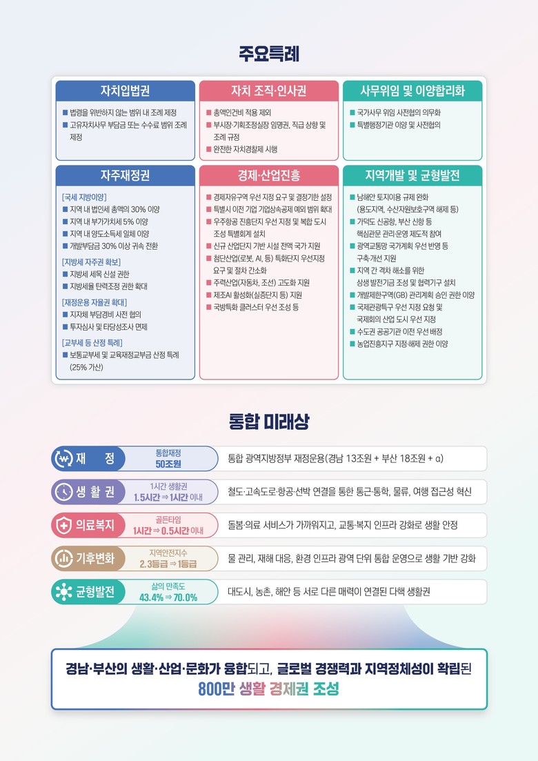 부산·경남은 통합 자치단체가 실질적인 권한과 책임을 갖고 운영되기 위해서는 재정권의 독립이 전제돼야 하며, 단기 인센티브 중심의 지원 방식으로는 통합 이후 발생할 행정·재정적 부담과 책임을 감당하기 어렵다고 밝혔다.