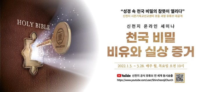 [세계타임즈 백진욱 기자] 신천지예수교 증거장막성전(총회장 이만희·이하 신천지예수교회)이 요한계시록 세미나에 이어 새해 1월 3일부터 ‘천국 비밀 비유와 실상 증거 세미나’를 시작한다. 이번 세미나는 천국에 대한 비밀을 비유로 감추었다가(마13:34~35) 때가 되면 밝히 알려주시겠다(요16:25)는 신약 성경 말씀 그대로 요한계시록이 성취된 때 천국 비밀 비유의 참 뜻을 성경에 의거하여 그 답을 명쾌하게 열어 전 세계에 전하는 자리다.