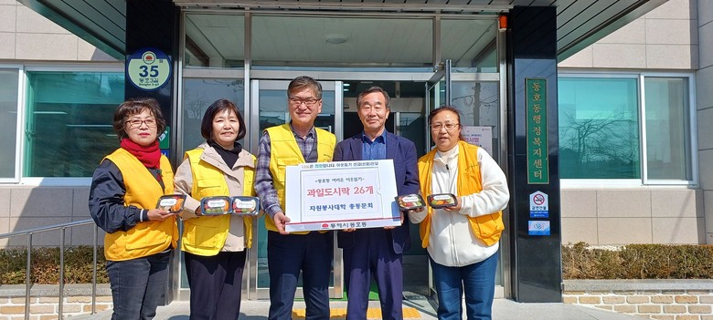[동해시 세계타임즈=김민석 기자] 동해시자원봉사대학 총동문회(회장 김형원)는 지난 10일 동호동행정복지센터를 방문하여 과일 도시락 26팩을 기탁했다.