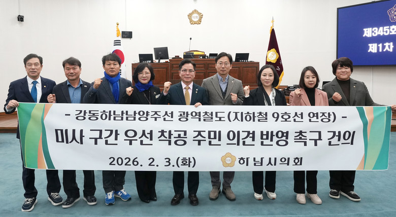 | ▲하남시의회는 2월 3일 제345회 제1차 본회의에서 ‘강동하남남양주선 광역철도(지하철 9호선 연장) 미사 구간 우선 착공 주민 의견 반영 촉구 건의안’을 채택했다. (사진=하남시의회 제공) |