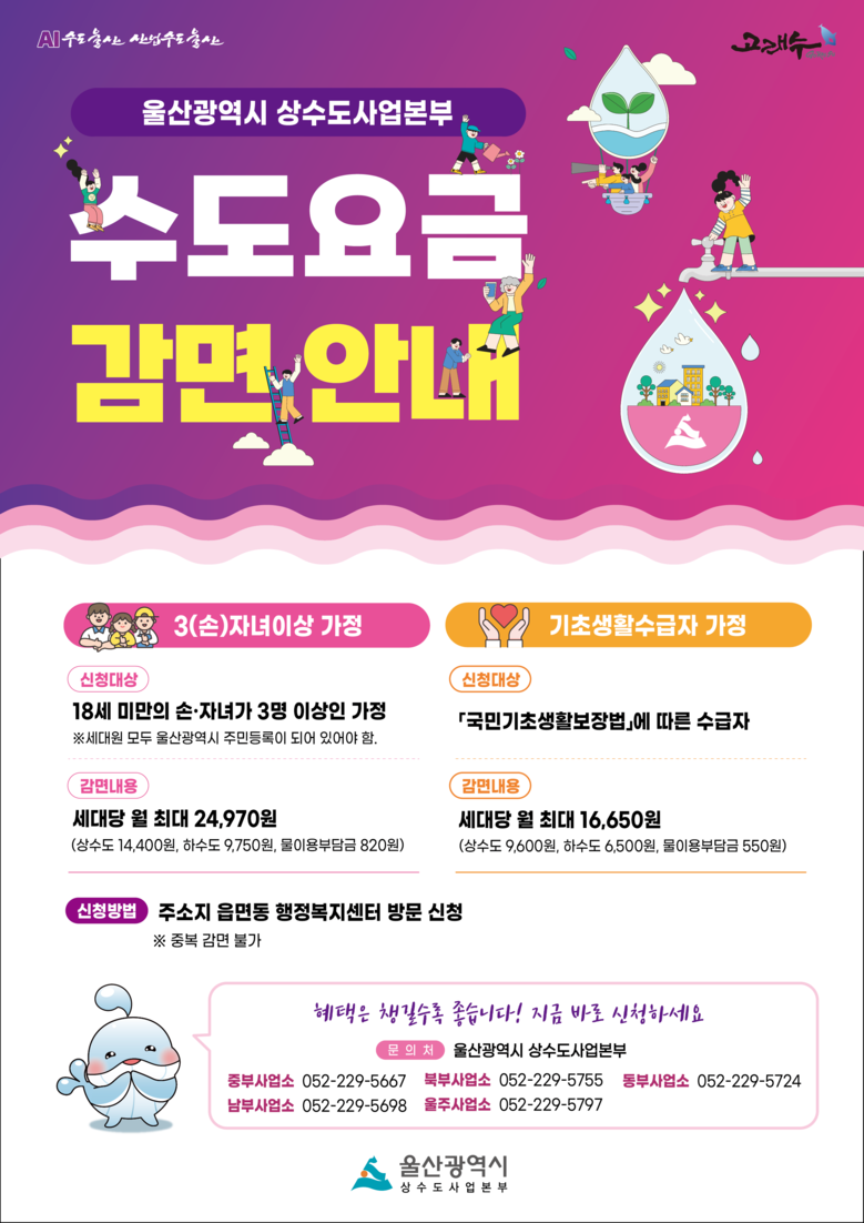 상수도사업본부 관계자는 “3(손)자녀 이상 가정을 위한 체감도 높은 생활 밀착형 감면 혜택을 제공해 다자녀 가정에 대한 사회적 우대 분위기가 조성되길 기대한다”라며 “내 이웃인 기초생활수급자에게 깨끗한 물 한방울로 울산의 온정을 나눌 수 있도록 계속해서 노력하겠다”라고 말했다.