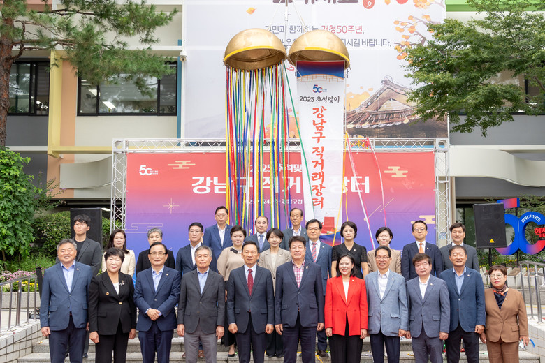 | ▲ 24일 강남구의회 의원들이 ‘2025 추석맞이 강남구 직거래 장터’에서 단체사진을 찍고 있다.(첫 번째 줄 우측에서 6번째 이호귀 의장, 4번째 복진경 부의장, 3번째 이동호 운영위원장, 두 번째 줄 우측에서 6번째 이도희 경제도시위원장, 7번째 김현정 복지문화위원장) |