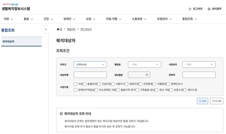 먼저 ‘복지대상자 통합조회’를 도입해 한 번의 검색으로 대상자가 지원받은 내역, 상담기록, 복지사업 참여 이력 등의 정보를 실시간 공유해 한 화면에서 조회할 수 있게 개선했다.