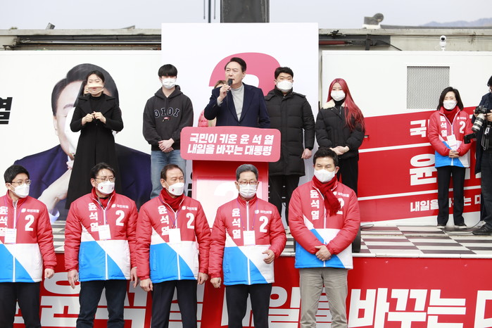 윤 후보는 그러면서 "지금 민주당이 김대중 전 대통령과 노무현 전 대통령의 정신을 이어받은 정당이 맞냐"며 "3월9일 단호한 심판을 통해 우리의 미래를 새로 만들어야 한다"고 말했다.
