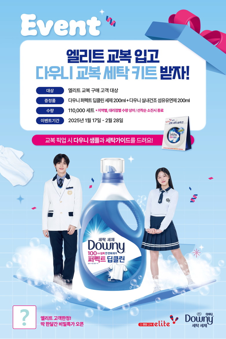 이벤트로 증정하는 ‘교복 세탁 키트’에 포함된 다우니 제품은 세제와 섬유유연제 2종으로, ‘퍼펙트 딥클린(200ml)’과 ‘실내건조(200ml)’로 구성되어 있다. 이와 함께 셔츠, 바지, 스커트는 물론이고 체육복, 생활복, 니트류와 점퍼까지 다양한 품목과 소재와 맞춰 최적의 세탁 방법과 관리법을 알려 주는 ‘교복 세탁 가이드’ 안내서도 함께 제공한다.
