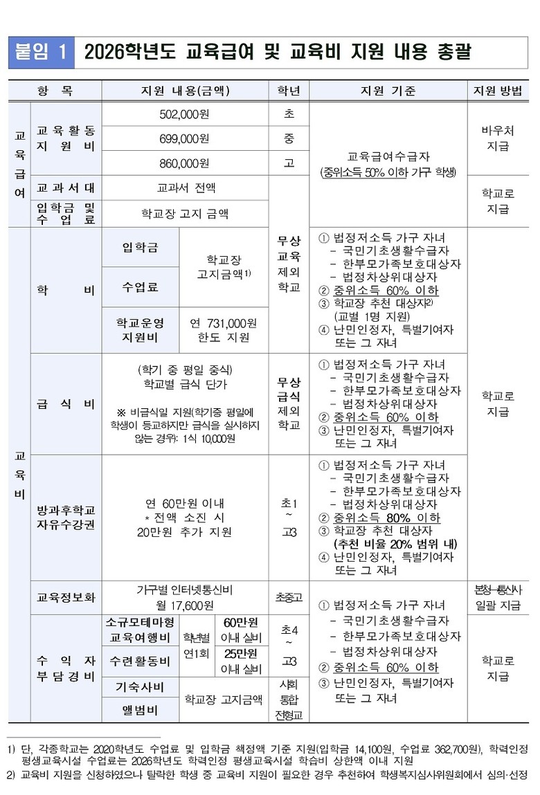 올해 교육급여 및 교육비 전체 지원 예산은 약 649억 원으로, 전년 대비 8%(약 48억 원) 증액된 규모다. 특히 주요 항목의 지원 단가를 상향하여 교육복지의 실효성을 한층 강화했다.