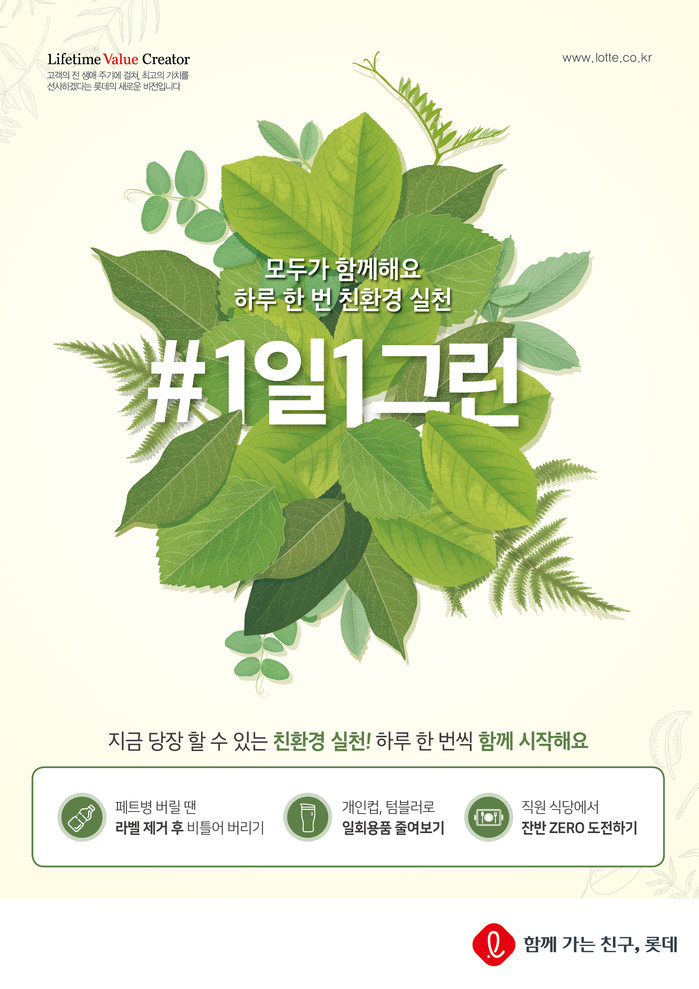 [세계타임즈 이현진 기자] 롯데는 5일, ‘환경의 날’을 맞아 일상 속에서 누구나 실천 가능한 친환경 활동들을 독려하는 ‘#1일1그린’ 활동을 이 달부터 전 계열사에서 실시한다고 밝혔다. 롯데는 지난 2월 그룹 차원의 자원 선순환 프로젝트 계획을 발표한 바 있으며, 이번 ‘#1일1그린’ 활동은 그 일환으로 전 그룹사 현장에서 친환경 활동에 대한 공감과 실천 의지를 확산하고 성공사례들을 발굴하기 위해 시작하게 되었다.