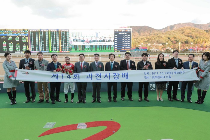이날 ‘과천시장배’의 시상식에는 한국마사회 김종국 경마본부장과 과천시 김기세 부시장 등이 참석했다. 우승한 안토니오 기수와 서인석 조교사에게 트로피와 꽃다발을 전달했다.