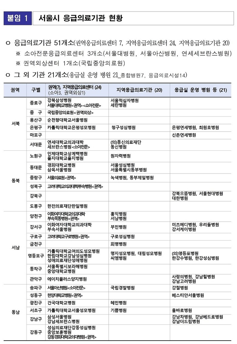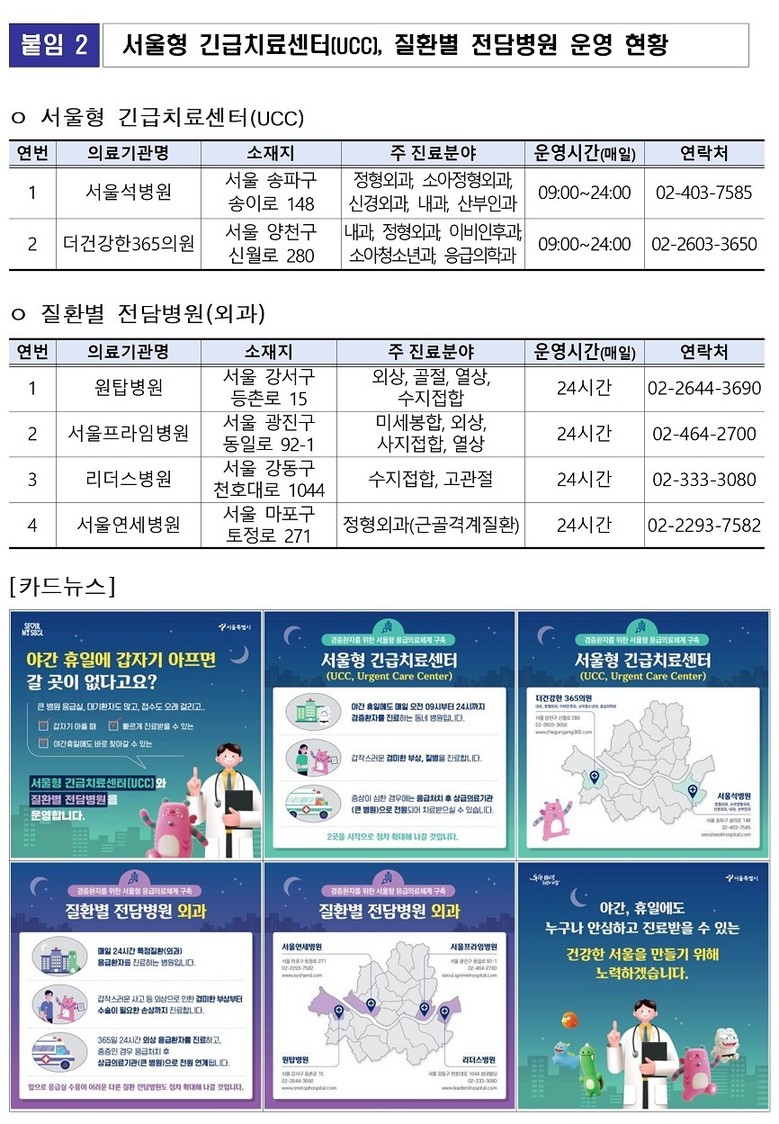 또한 응급실 이용이 어려운 경증 환자의 긴급한 진료가 가능한 서울형 긴급치료센터 2개소와 질환별 전담병원(외과계) 4개소도 연휴 기간 휴일 없이 운영된다.