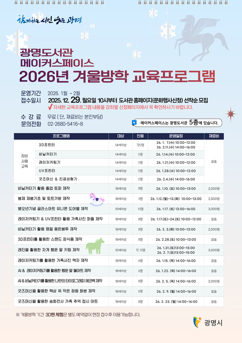 - 병오년 맞이 도어벨·가족사진 퍼즐 등 첨단 장비 활용 17개 강좌 운영 [세계타임즈=광명시 송민수 기자] 광명시(시장 박승원) 광명도서관은 오는 29일부터 ‘메이커스페이스 2026년 겨울방학 교육 프로그램’ 참가자를 모집한다.