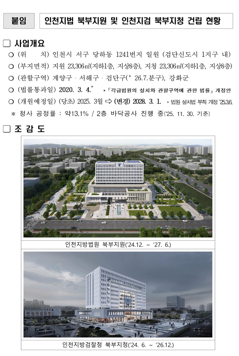 - 사법접근성 혁신부터 지역경제 활성화까지… 서부수도권 사법거점도시 도약 박차 - [인천 세계타임즈=심하린 기자] 인천광역시(시장 유정복)는 시민의 하나된 염원으로 2024년 11월 28일 인천고등법원 유치가 확정된 데 이어, 인천고등법원과 인천지방법원 북부지원 등이 2028년 3월 1일 차질없이 개원될 수 있도록 시 차원의 체계적인 후속추진계획을 지난 10월에 수립하여 2026년부터 본격적으로 추진한다고 밝혔다.