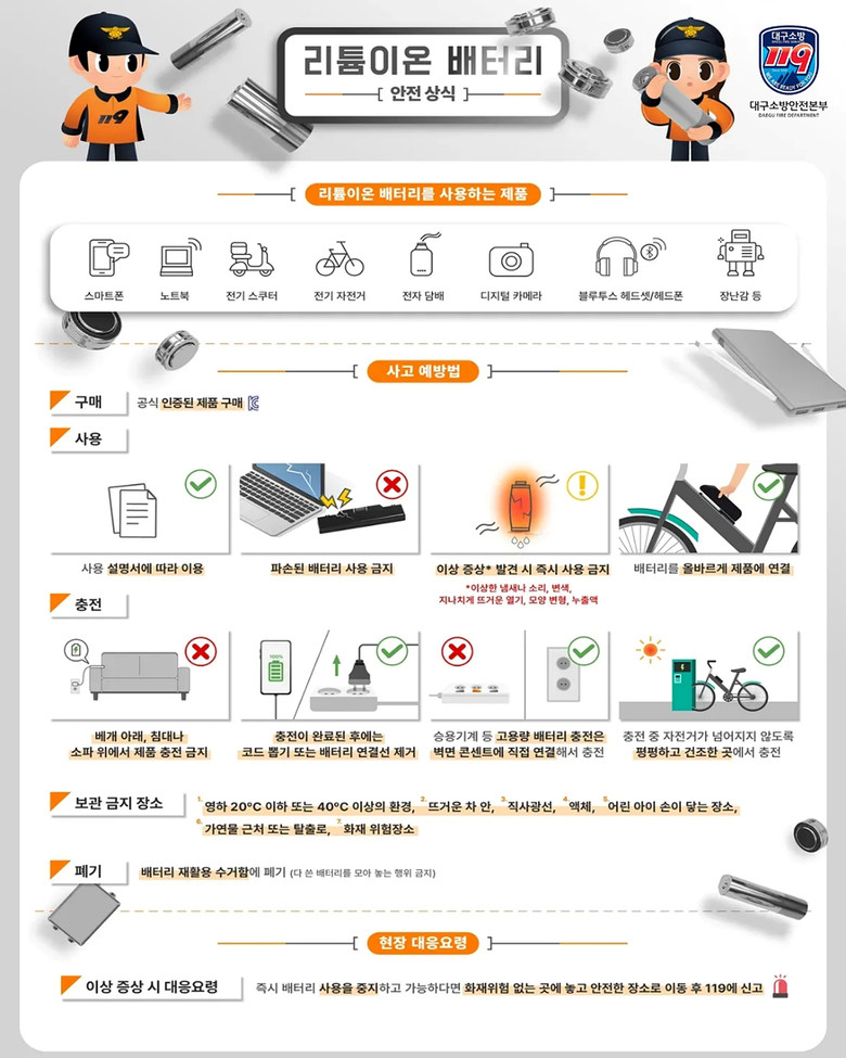 대구소방은 다음과 같은 리튬이온 배터리 안전수칙 준수를 강조했다.