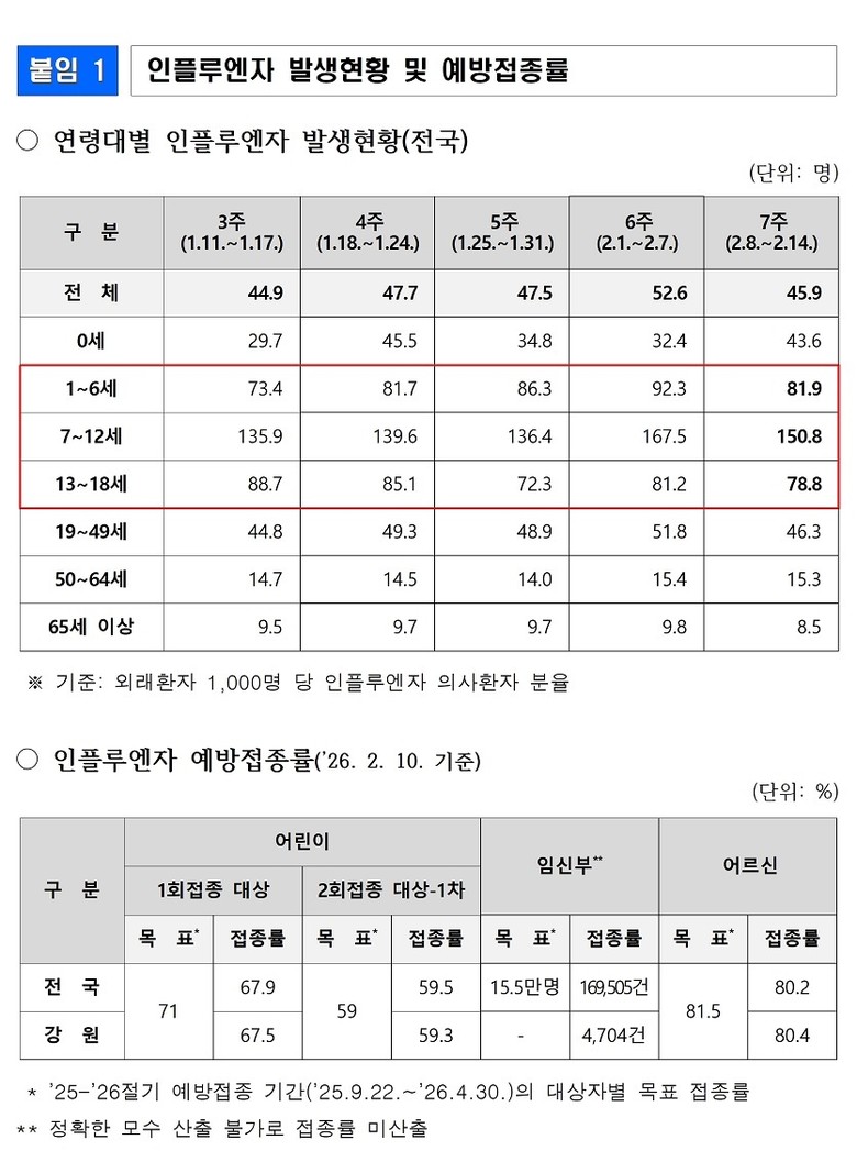 질병관리청 자료에 따르면 도내 인플루엔자 의사환자는 7주 차 22명으로, 전주(33.3명) 대비 감소했다. 다만 연령대별로는 7~12세, 13~18세, 1~6세 순으로 발생 비율이 높게 나타나 학령기 중심의 유행 양상이 뚜렷하다.