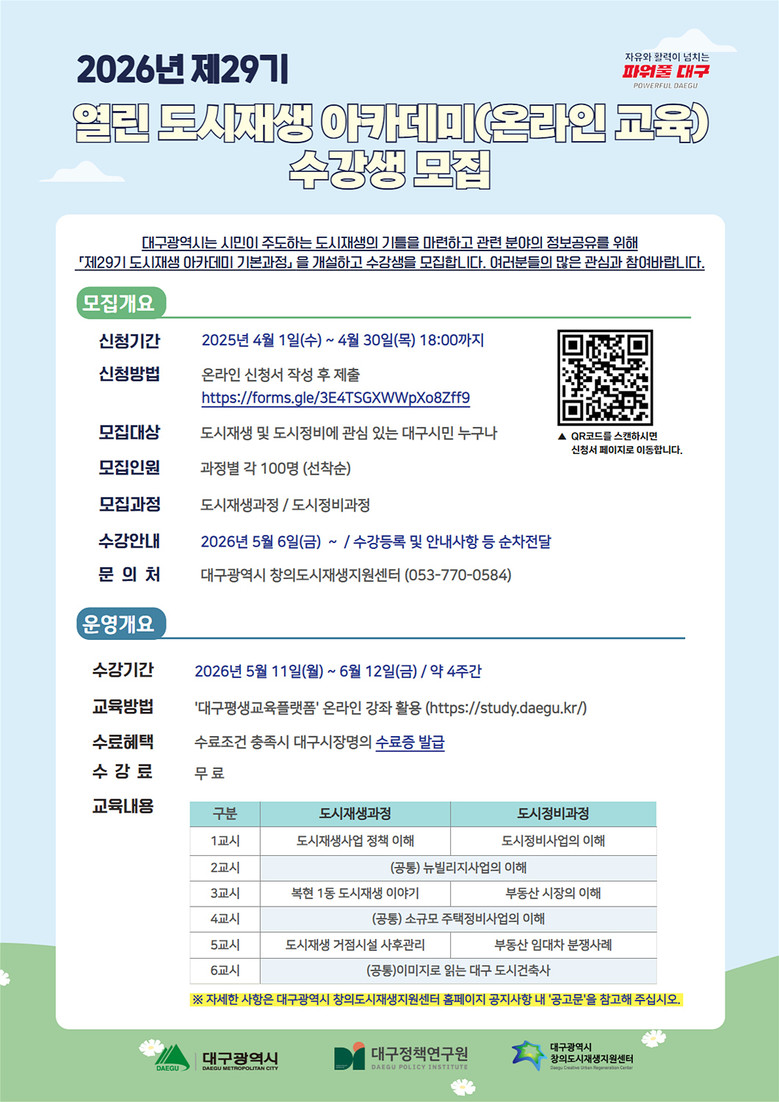 수강 신청은 4월 1일(수)부터 30일(목)까지 대구시 홈페이지(daegu.go.kr) 또는 대구 창의도시재생지원센터 홈페이지(dgucenter.or.kr)를 통해 온라인으로 가능하다. 과정별로 선착순 100명(총 200명)을 모집하며, 교육비는 전액 무료다.