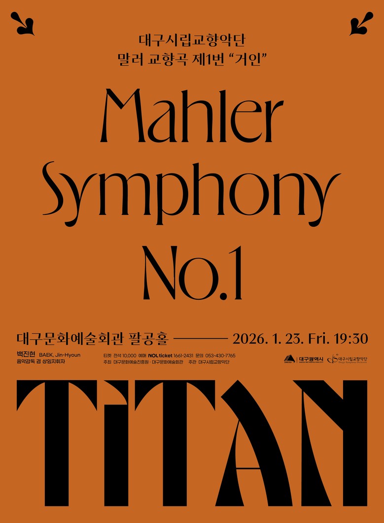 이번 공연은 제목 그대로 말러의 첫 번째 교향곡인 제1번 단 한 곡을 약 60분간 들려주며, 백진현 상임지휘자가 지휘봉을 잡는다. 신년의 시작과 맞물려, 청춘의 기쁨과 고뇌, 삶의 허무와 극복 의지를 담아낸 말러 음악의 풍부한 서사와 극적 에너지를 팔공홀에서 생생하게 감상할 수 있다. 특히, 전석 1만원이라는 합리적인 입장료로 마련되어 부담 없이 말러의 음악 세계를 만날 좋은 기회다.