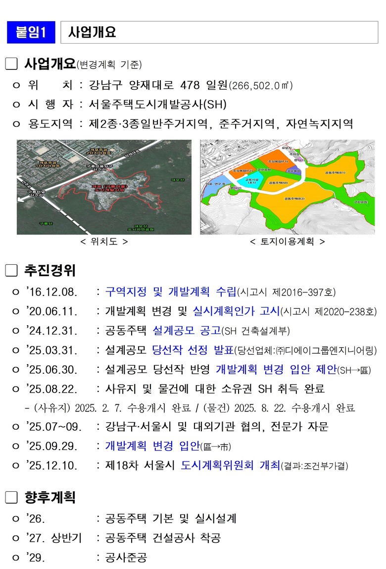 또한 산림과 인접한 경사 지형의 불편을 해소하기 위해 입체보행로를 조성해 주민 이동 편의를 높이고, 약 9만㎡ 규모의 근린공원 조성으로 구룡산 및 대모산과 연계된 녹지 네트워크를 구축함으로써 자연과 도시가 공존하는 자연친화형 주거단지를 조성할 계획이다.