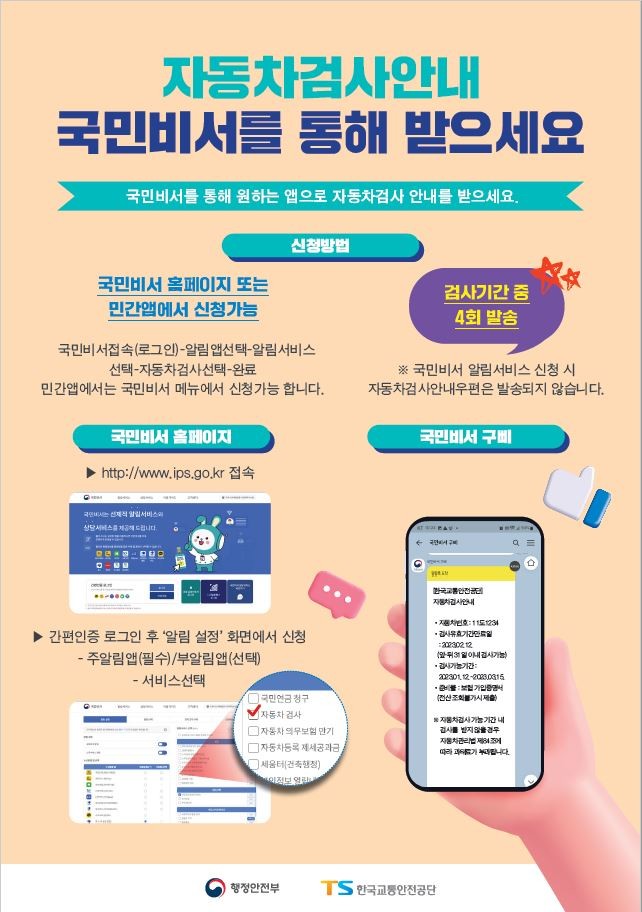 이를 해소하기 위해 지난해 12월부터 국민비서를 통한 자동차검사 사전안내 서비스를 시행했다.