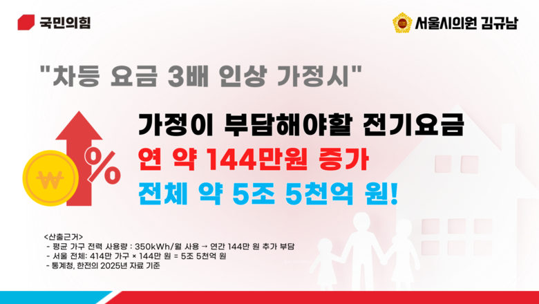 김규남 의원에 따르면 실제 가구당 연간 전기요금은 지금보다 144만 원 늘어나고, 서울 전체로는 5조 5천억 원 규모의 추가 부담이 발생한다는 분석이 나왔다. 가정뿐 아니라 자영업자, 전기를 많이 사용하는 데이터센터와 기업에도 직격탄이 될 수 있으며, 이 경우 서울의 산업 경쟁력 자체가 무너질 수 있다는 우려를 표했다.