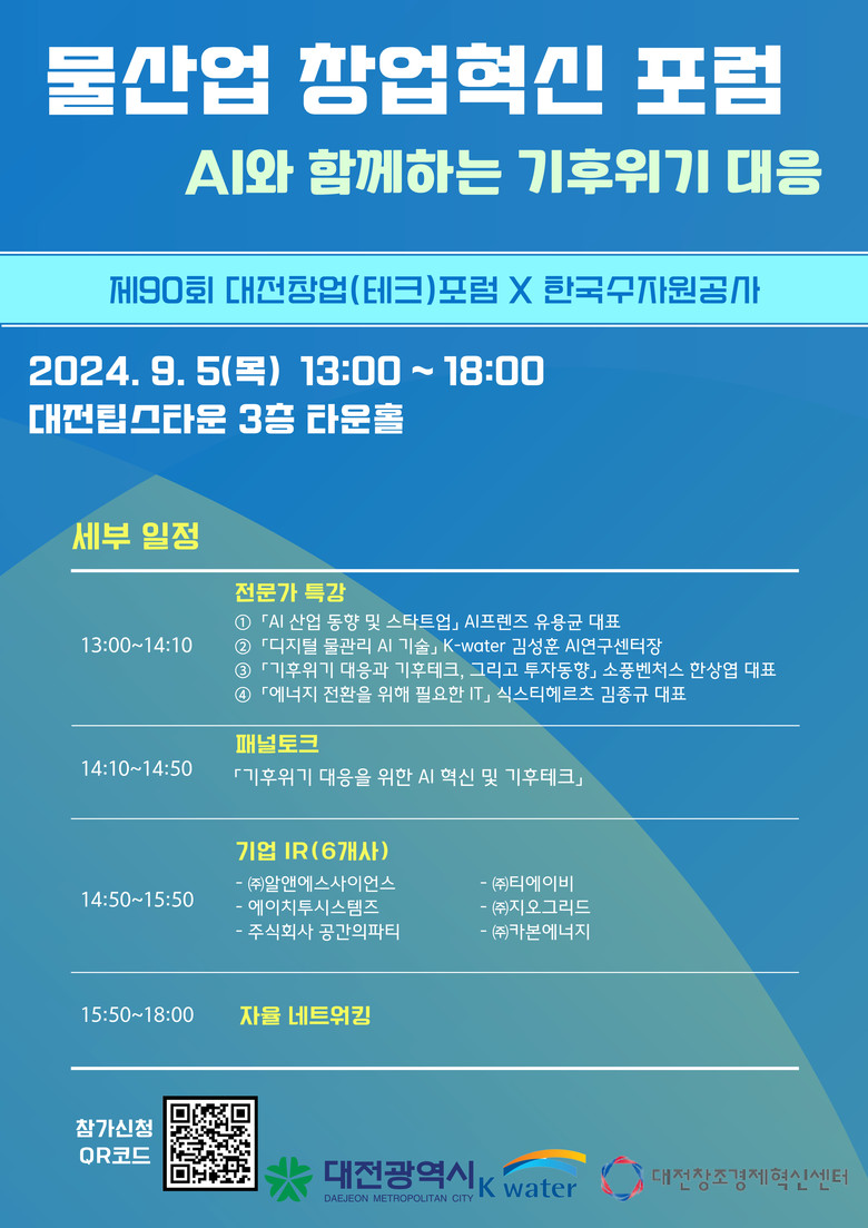이 밖에도, 9월 5일 대학로99 소재 팁스타운에서 ‘물산업 창업혁신 포럼’을 개최한다. AI프렌즈 유용균 대표와 한국수자원공사 김성훈 AI 연구센터장의 인공지능(AI) 분야 특강, 소풍벤처스 한상엽 대표와 식스티헤르츠 김종규 대표의 기후위기 및 에너지 분야 특강과 함께 창업기업 및 투자사 등이 함께하는 ‘패널토크’가 순서대로 진행된다. 이어, ㈜알앤에스사이언스, ㈜티에이비, 에이치투시스템즈, ㈜ 지오그리드, 주식회사 공간의파티, ㈜카본에너지, 6개 사가 참여하는 ‘물산업 창업혁신 IR’이 진행되며, 포럼 참여자, 창업기업 및 투자사 등이 참여하는 교류의 시간도 마련될 예정이다.
