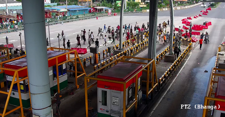 | ▲ 8월 5일, 방글라데시 하시나 총리 사임 직후 시위대가 고속도로에 난입하여 달레쇼리 영업소 시설을 파괴하고 있다. |