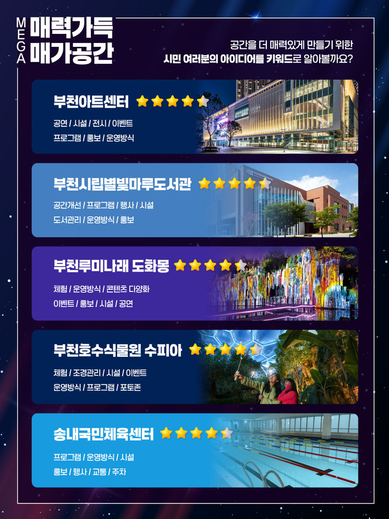 공모는 지난 11월 19일부터 12월 3일까지 14일간 진행됐으며, 1,900여 명의 시민이 참여해 △부천아트센터 △송내국민체육센터 △루미나래(도화몽) △부천호수식물원 수피아 △별빛마루도서관 등 5개 공간에 대한 평가와 의견을 제시했다.