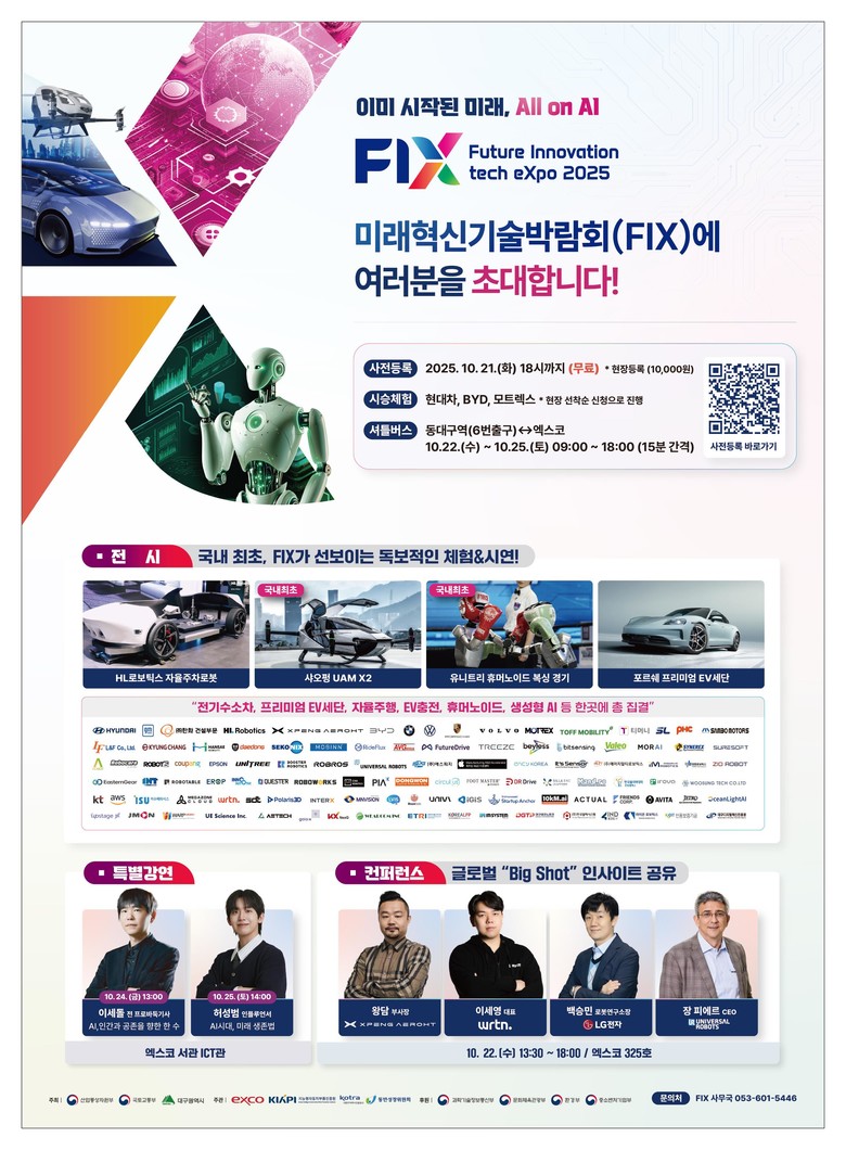 홍성주 대구광역시 경제부시장은 “어려운 경제산업 여건 속에서도 글로벌 혁신기술과 콘텐츠 유치에 심혈을 기울여 왔다”면서, “FIX 2025 성공 개최를 통해 대구시가 새정부 정책에 부응하는 AX 선도도시로 다시 도약할 수 있도록 남은 기간 동안 준비에 만전을 기하겠다”고 말했다.