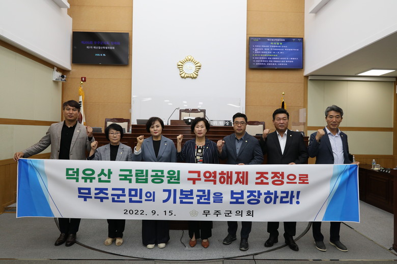 무주군의회는 “덕유산 국립공원은 환경보전이라는 미명 하에 주민 의견수렴 절차 없이 일방적으로 지정됐다. 군민들은 47년 동안 각종 규제와 통제로 사유재산권을 침해당했고 무주군은 개발행위 제한으로 지역 균형발전을 이루지 못했다”며 무주군 행정구역 중 28%를 차지하고 있는 덕유산 국립공원의 구역 재조정은 필수라고 강조했다.
