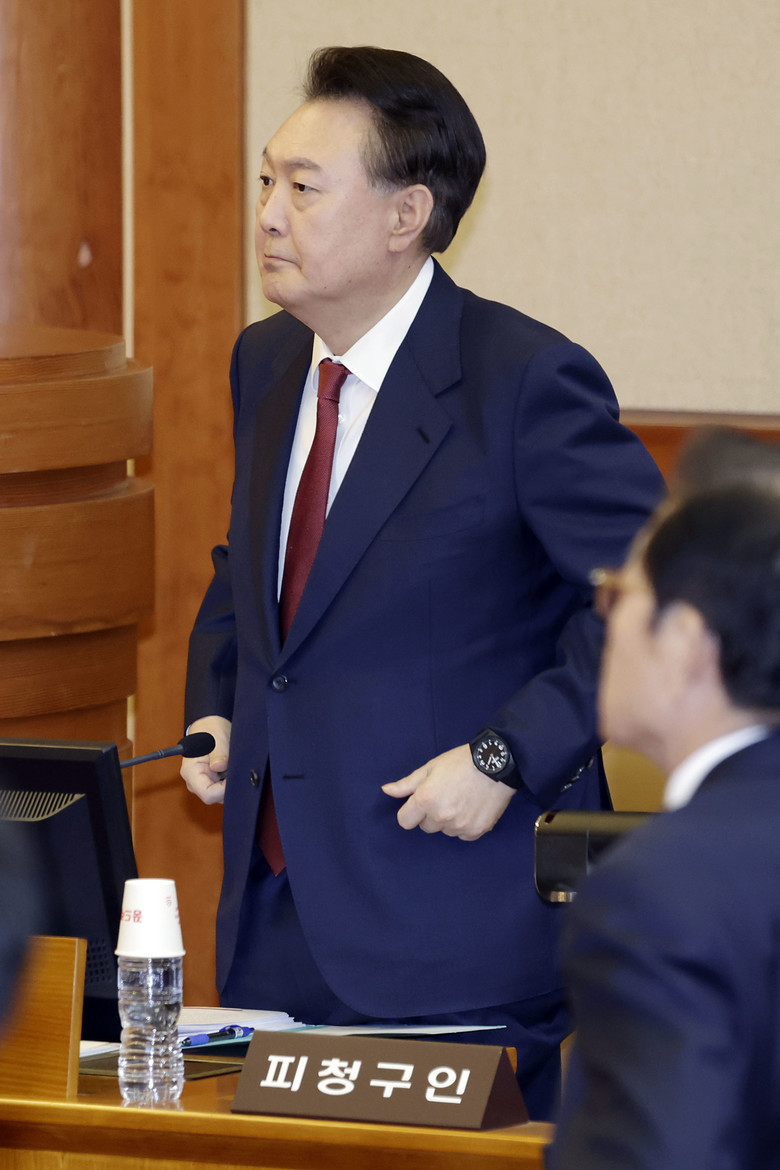 [세계타임즈 = 조윤수 기자] 윤석열 대통령이 4일 서울 종로구 헌법재판소에서 열린 탄핵심판 5차 변론기일에 출석해 헌법재판관 입장에 일어서 있다. 2025.2.4 [사진공동취재단]