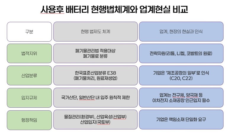 현행법하에서는 폐기물로 분류되어 억제‧처리 중심 관리체계속의 폐기물처리시설로 국가산단 입주가 막히는 구조가 되지만, 전략자원으로 분류되면 공급망 확보와 자원 안보 차원에서 산업시설이 되어 자원순환 산업 육성과 입주 제한 문제들이 일거에 해소될 것으로 기대된다.