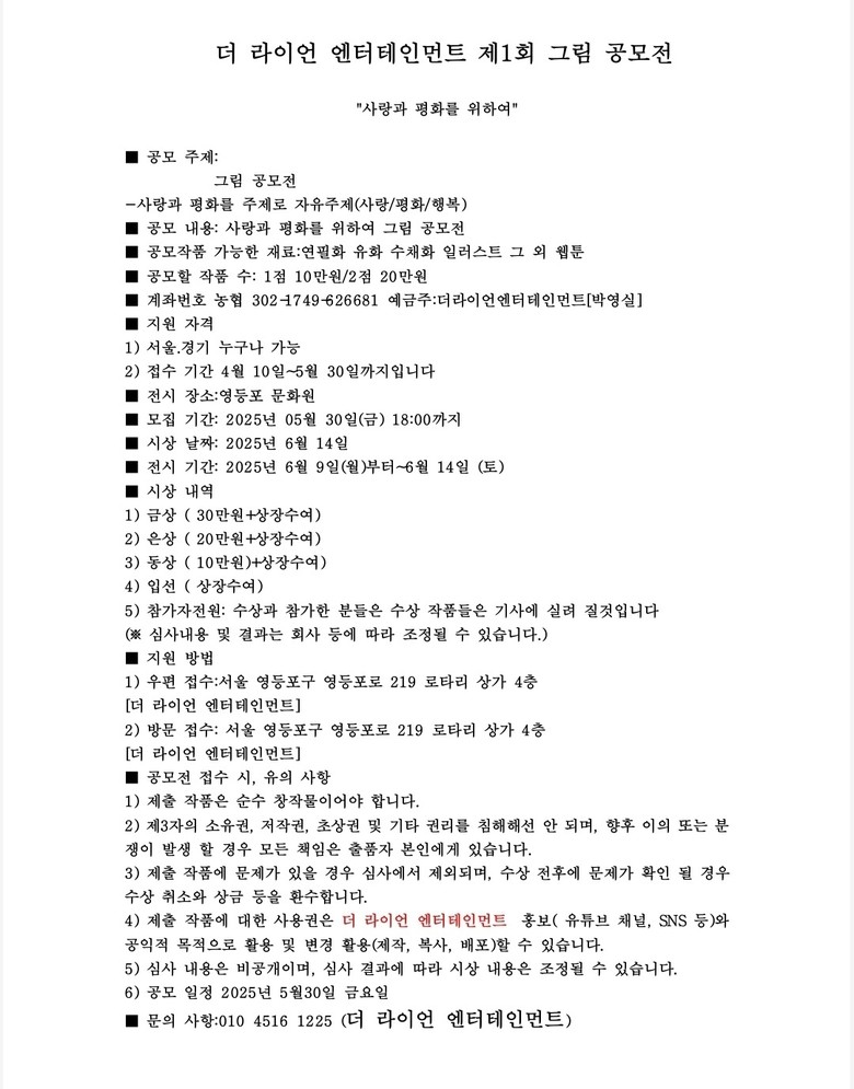더라이언 엔터테인먼트에서는 제 1회 그림 공모전을 2025년 6월 9일(월)-14일(토)까지 실시한다.