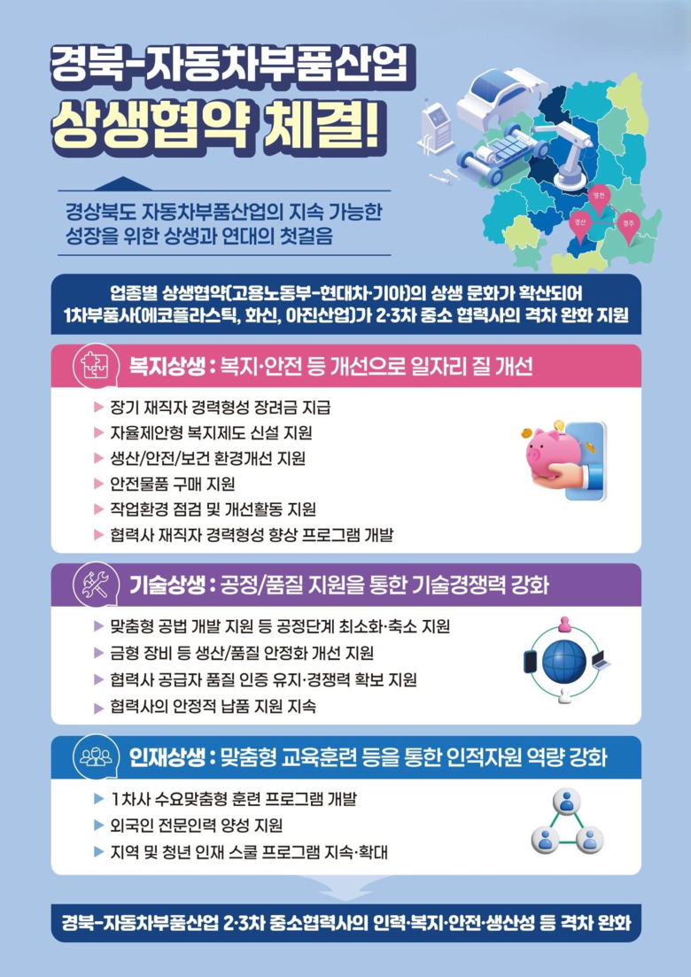 이번 협약에 따라 도내 자동차부품 협력사 근로자에게는 장기재직 장려금 지원(160명), 협력사 기업에는 자율제안형 복지 지원, 안전.복지.환경 개선, 안전 물품 지원, 수익성 및 생산/품질 개선 등을 지원한다.