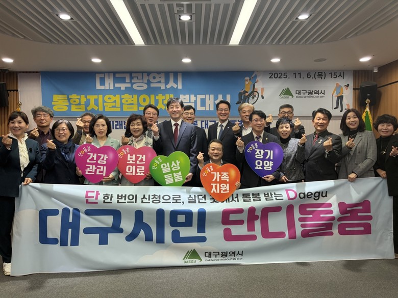 ▸ 내년 3월부터 대구형 통합돌봄 정책 ‘단디돌봄’ 본격 추진 [세계타임즈=대구 한윤석 기자] 대구광역시는 11월 6일(목) 오후 3시 동인청사 2층 상황실에서 ‘대구광역시 통합지원협의체’ 발대식을 열고, 의료·요양·돌봄 등 각 분야 전문가 20명을 위원으로 위촉했다.