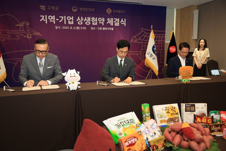 고창군이 4일 오전 고창군 웰파크호텔에서 행정안전부, 롯데웰푸드와 ‘지역 상생발전을 위한 업무협약’을 체결했다. 협약식은 심덕섭 고창군수, 김민재 행정안전부 차관, 배성우 롯데웰푸드 마케팅본부장을 비롯한 실무 관계자들이 참석한 가운데 진행됐다.