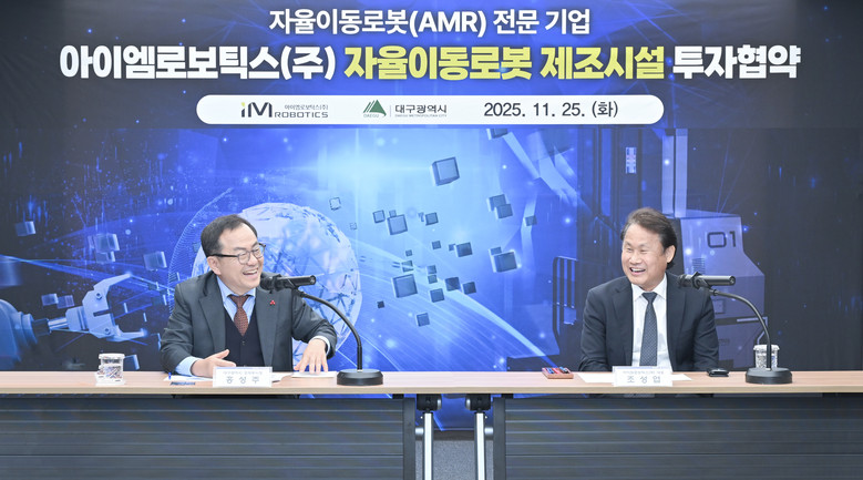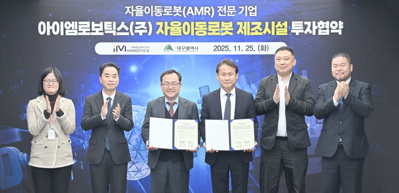 [세계타임즈=대구 한윤석 기자] 대구광역시는 11월 25일(화) 오후 3시, 시청 산격청사에서 아이엠로보틱스㈜(대표이사 조성엽)와 금호워터폴리스 내 ‘자율이동로봇(AMR, Autonomous Mobile Robot) 제조시설 건립’을 위한 투자협약을 체결했다.