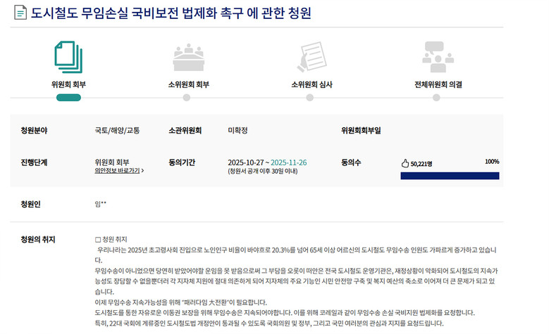청원은 초고령사회 진입으로 무임수송 인원이 급증하면서 도시철도 운영기관의 재정 부담이 한계에 달한 상황을 국민에게 알리고 국비 지원 논의의 장을 마련하기 위한 취지로 제기됐다.