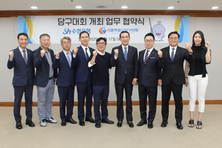 Sh수협은행과 서울특별시당구연맹은 지난 17일, 서울 송파구 Sh수협은행 본사에서 수협중앙회 노동진 회장과 Sh수협은행 신학기 은행장, 서울특별시당구연맹 유진희 회장, 서울특별시당구연맹 이수근 수석부회장(방송인) 등 관계자들이 참석한 가운데 대회 개최를 위한 업무협약을 체결했다.