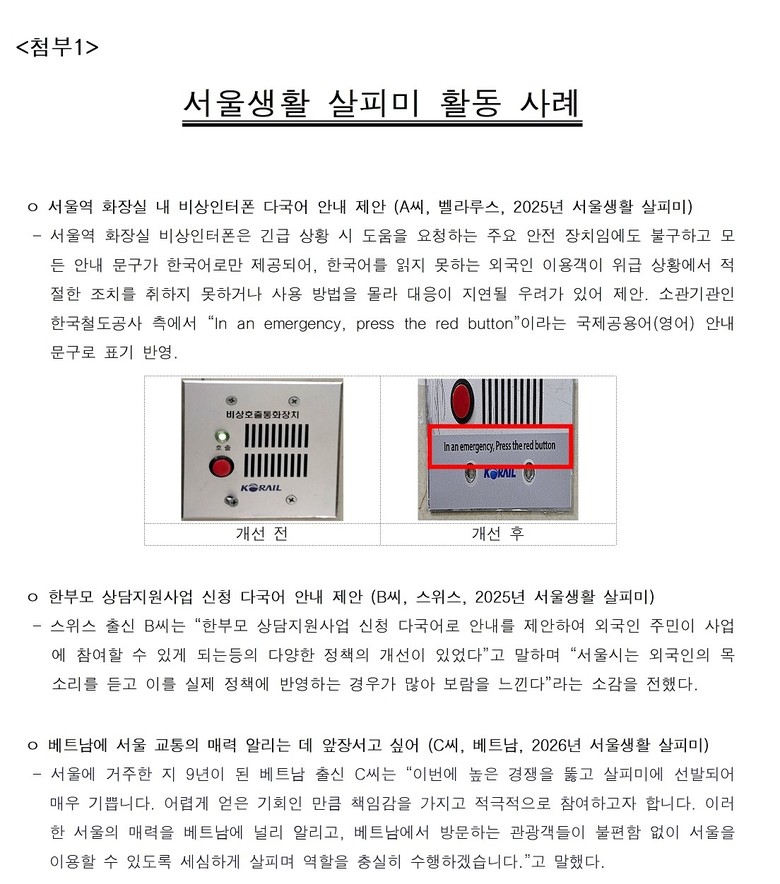 # 스위스 출신 레토(가명) 씨는 한국어에 서툰 외국인을 위해 서울시 ‘한부모 가정 상담 지원사업’을 다국어로 안내해 달라고 제안, 지난해부터 2개 국어(한국어, 영어)로 사업이 안내되고 있다. 또 벨라루스 출신 엘라니(가명) 씨 요청으로 외국인이 많이 찾는 서울역 화장실 내 비상인터폰에는 국제공용어(영어)가 병기됐다. |