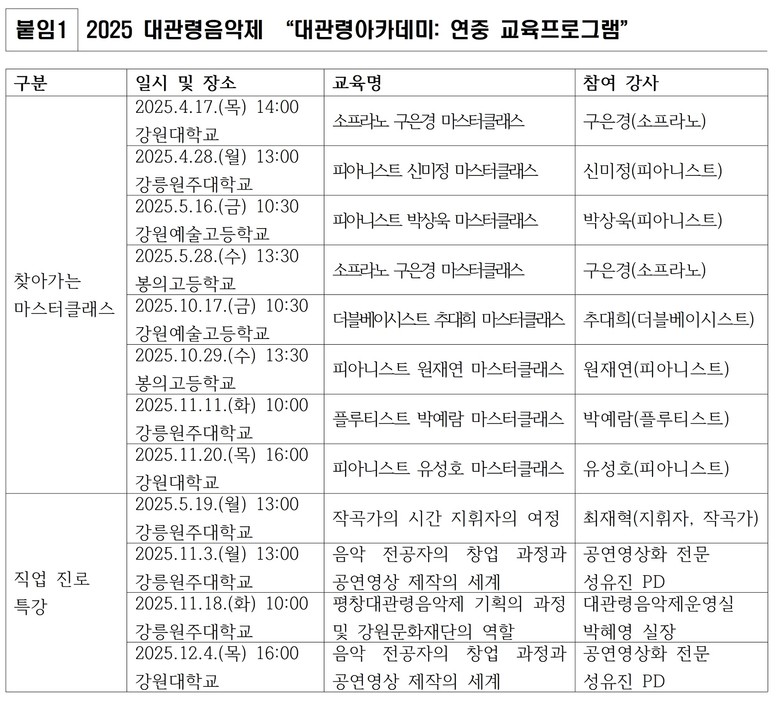 대관령아카데미의 연중 교육프로그램은 ‘찾아가는 마스터클래스’와 ‘직업 진로 특강’을 중심으로 운영되고 있으며, 올해도 도내 음악학도들이 실기 경험을 확장하고 다양한 진로를 탐색할 기회를 제공했다.