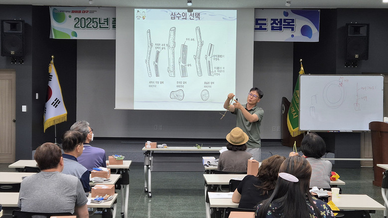 품목별 농업인 맞춤형교육 포도접목반은 지난 3월 복숭아 접목교육에 이어 과수류 접목기술 보급을 통해 농가 묘목 자급률을 높여 농사비용을 절감하고 변화하는 농업현장에 능동적으로 대응하기 위해 마련됐다.