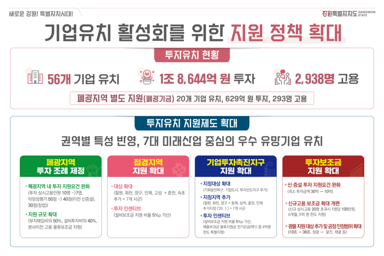 - 기업투자촉진지구는 기회발전특구‧투자선도지구‧기업도시를 지정 대상에 포함하고, 지정 지역을 기존 3개 시군(철원, 화천, 양구)에서 동해, 삼척, 홍천, 인제를 추가해 총 7개 시군으로 확대했으며, 설비보조금 5%p 가산과 배출부과금 지원 항목을 추가했다.
