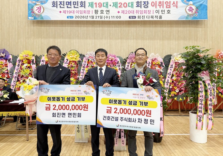 이날 기탁식에서는 회진면 면민회(회장 이민호)가 200만 원, 건호건설 주식회사(대표 차정민)가 200만 원을 각각 기탁하며, 지역의 어려운 이웃과 복지 사각지대 해소를 위한 따뜻한 나눔에 동참했다.