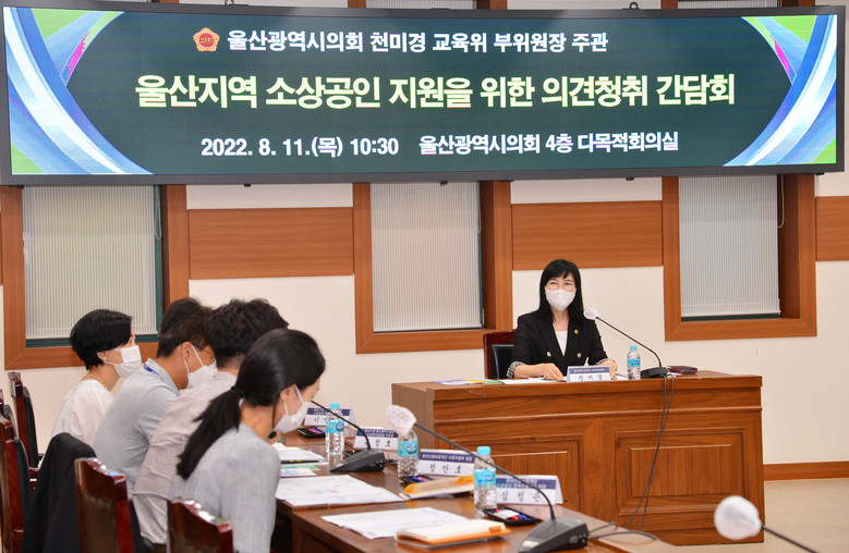 [울산 세계타임즈=이호근 기자] 울산광역시의회 교육위원회 천미경 부위원장은 11일 오전 10시 30분 4층 다목적회의실에서 울산지역 소상공인연합회와 울산신용보증재단 행복드림센터 및 시청 중소벤처기업과 관계자가 참석한 가운데 ‘울산지역 소상공인 지원 방안’에 대한 의견청취 간담회를 가졌다.