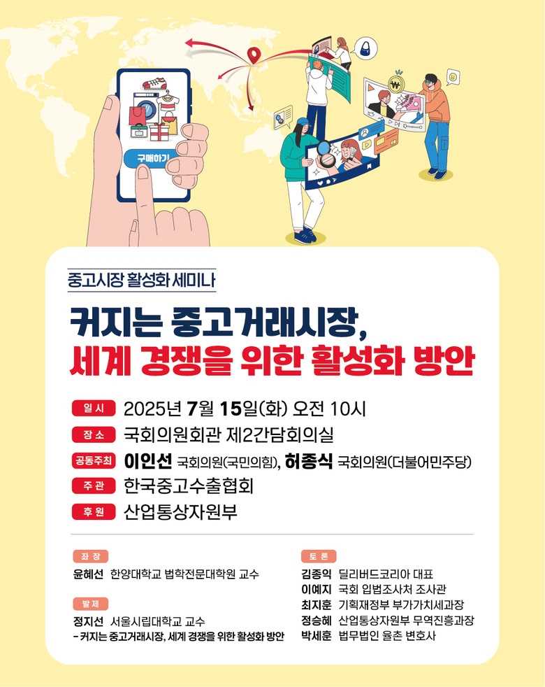 이어지는 토론에는 한양대학교 법학전문대학원 윤혜선 교수가 좌장을 맡아 진행하며 , 딜리버드코리아 김종익 대표 , 법무법인 율촌 박세훈 변호사 , 산업통상자원부 무역진흥과 정승혜 과장 , 기획재정부 부가가치세제과 최지훈 과장 , 국회 입법조사처 이예지 조사관이 참여해 중고거래시장 제도 개선과 활성화 방안을 심층적으로 논의한다 .