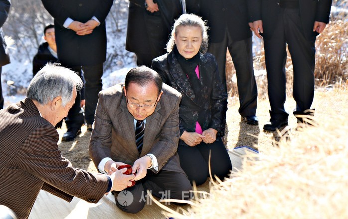 28일 설을 맞아 충북 음성군 원남면 상당리 부친 산소에서 반기문 전 유엔 사무총장이 헌작하고 있다. 2017.01.28.