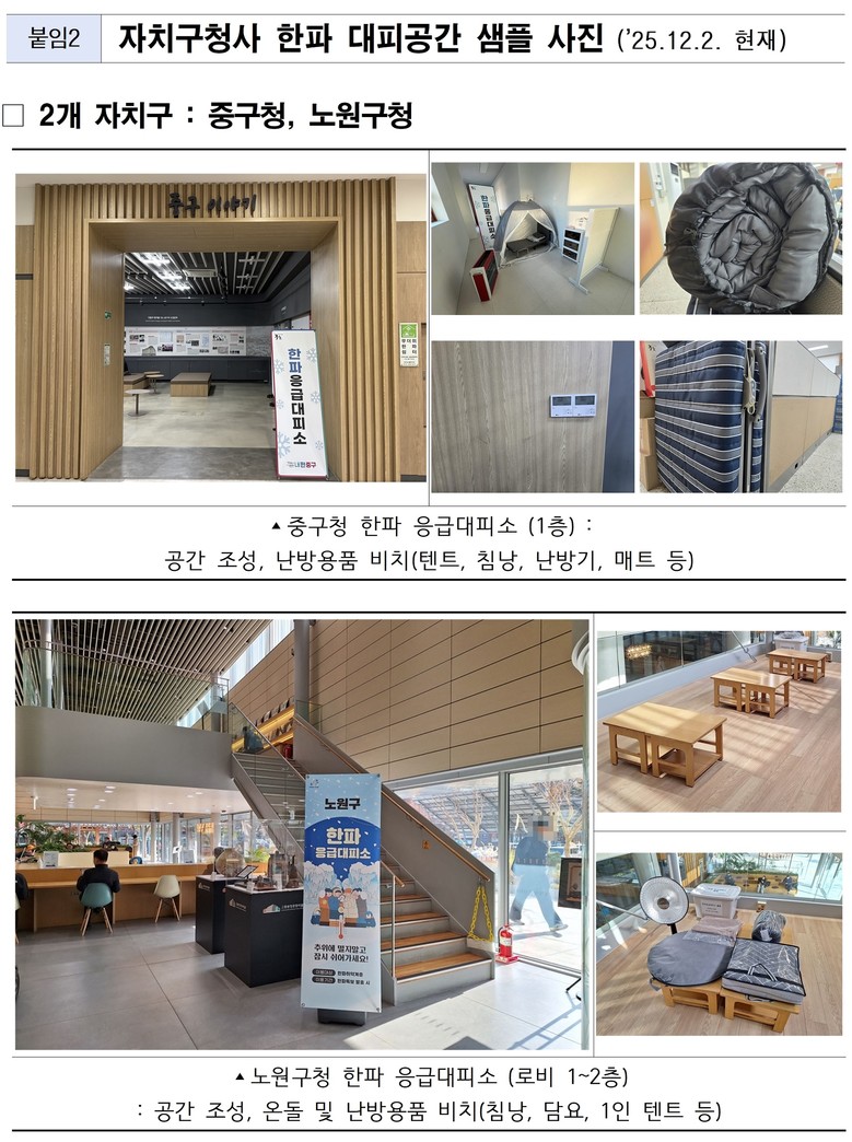 이번에 특보가 발효된 21개 자치구 중 20개 자치구청사는 오전 9시부터 오후 6시까지 운영되던 ‘한파쉼터’를 한파특보(주의보‧경보) 발효 기간 동안 24시간 개방하는 ‘한파 응급대피소’로 확대 운영한다. 야간에 추위를 피할 곳이 마땅치 않은 한파 취약계층을 보호하기 위한 조치로, 자치구별로 독립된 공간에 난방기‧침낭‧담요 등 난방용품을 추가로 구비해 빈틈없이 운영할 수 있도록 했다.