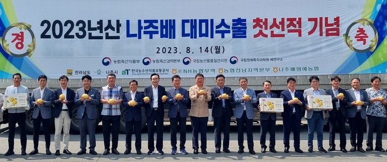 [세계타임즈 = 이현진 기자] 한국농수산식품유통공사 김춘진 사장은 14일 나주배원예농협 산지유통센터(조합장 이동희)를 찾아 2023년산 나주 햇배 미국 첫 수출 선적식에 참석했다.