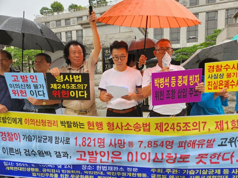 [세계타임즈 백진욱 기자] 어제(8.10. 목) 낮 2시부터 약 30분 동안 종로구 계동에 있는 헌법재판소 정문 앞에서 강한 비바람이 몰아치는 날씨에도 ‘가습기살균제 등 사회적 참사재발 방지와 안전사회 건설 등을 위한 연대모임’(약칭: 안전사회건설연대모임) 등 총 17개 시민환경단체 대표와 회원 등 약 20여명이 현행 형사소송법 제245조의7 제1항이 고발인으로부터 이의신청권리를 박탈하는 위헌임을 확인해달라고 청구하는 헌법소원 제기하는 기자회견을 열었다.